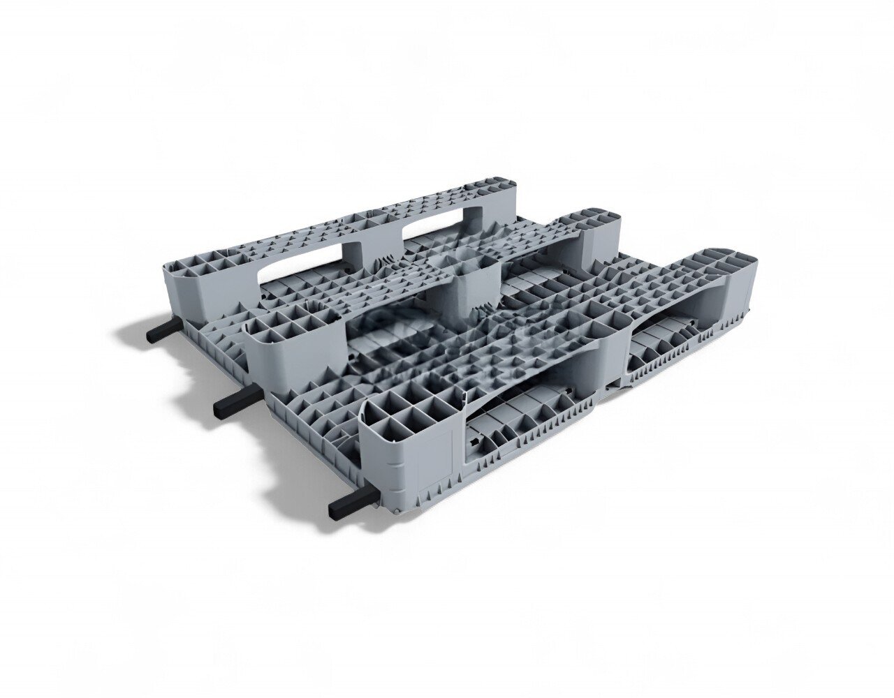 The 3 Runner Flat Pallet with steel, Built for performance, measuring 1200 x 1000 x 150 mm (LWH), combines durability and efficiency. Reinforced with three steel rods and equipped with safety rims, this steel rod 3 Runner flat pallet ensures the secure handling of your goods, even under demanding conditions.